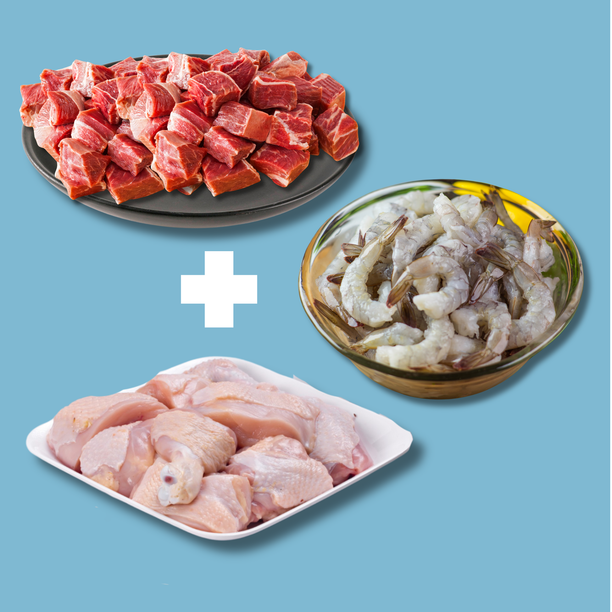 Beef mix+Baby Chicken curry cut+ Uncleaned Prawns